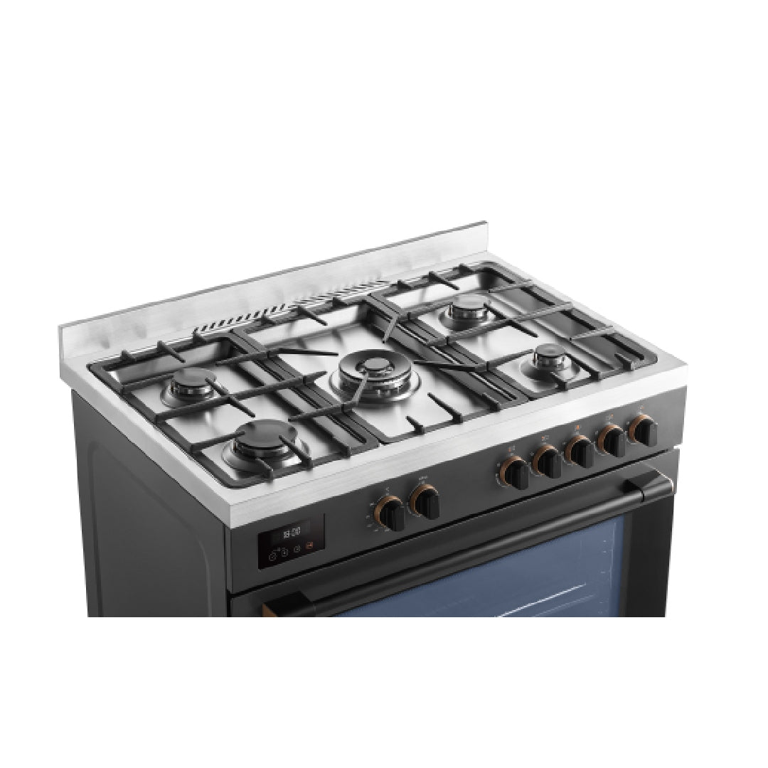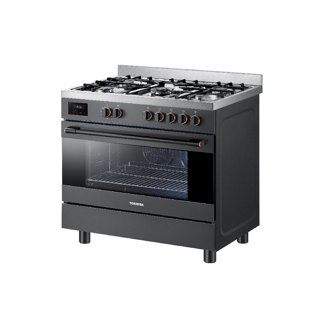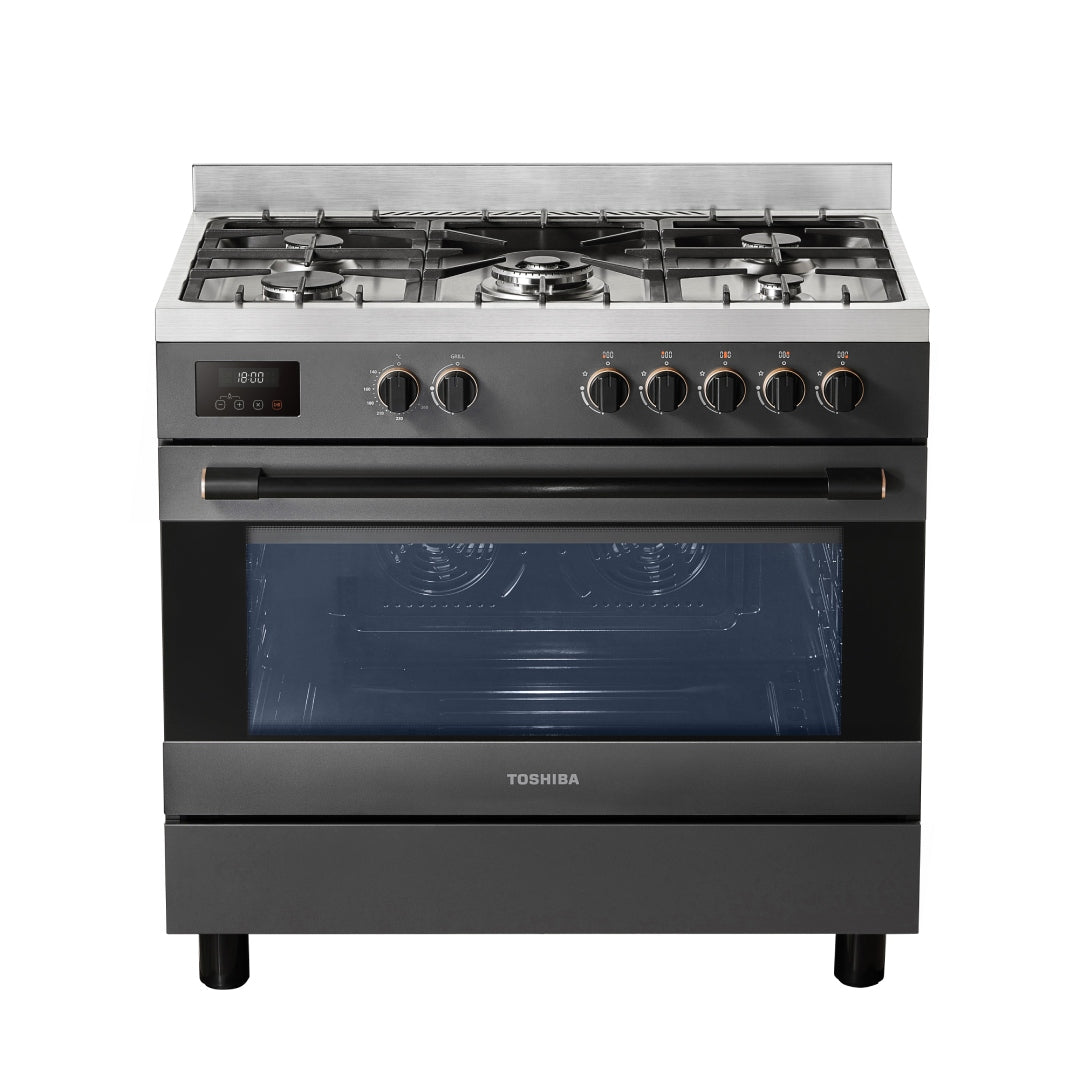 موقد غاز احترافي من توشيبا 5 شعلات 90×60 مع شواية دوارة ، باللون الرمادي الموراندي