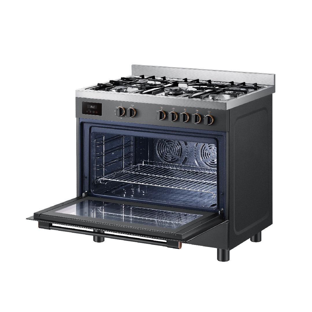 ارتقِ بمطبخك مع موقد الغاز الاحترافي من توشيبا 5 شعلات 90x60 سم بلون الرمادي موراندي الرائع. مصمم بهيكل جريء وأنيق مع مقابض ومقبض من الذهب اللؤلؤي، يجمع هذا الموقد الفاخر بين الأداء القوي والأناقة الخالدة. مجهز بخمسة شعلات إيطالية من SABAF، ومروحتين للتدفئة بالتوازي لضمان طهي متساوٍ، وترموستات مدمج دقيق مع نطاق درجة حرارة واسع من 140°C إلى 260°C، مما يضمن نتائج بمستوى احترافي في كل مرة. يوفر لوحة تحكم LED واضحة وسهلة الاستخدام، بينما توفر تجويف إيناميل EaseMax مقاومة فائقة للخدوش والبقع مما يسهل عملية التنظيف. مع إشعال أوتوماتيكي بيد واحدة، ووظيفة الشواية، ودعائم من الحديد الزهر، وموقد غاز مع شعلات شواية علوي وسفلي، تقدم توشيبا الأمان والراحة والتنوع لا مثيل له في منزلك.